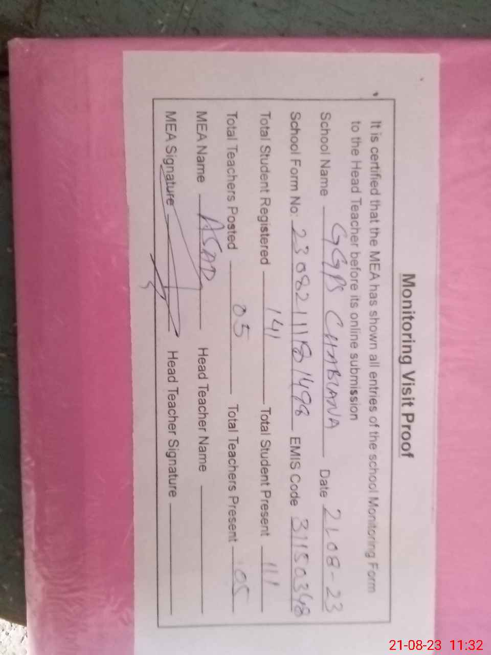 | Attendance Register | Head Teacher | MEA with School | Visit Proof |