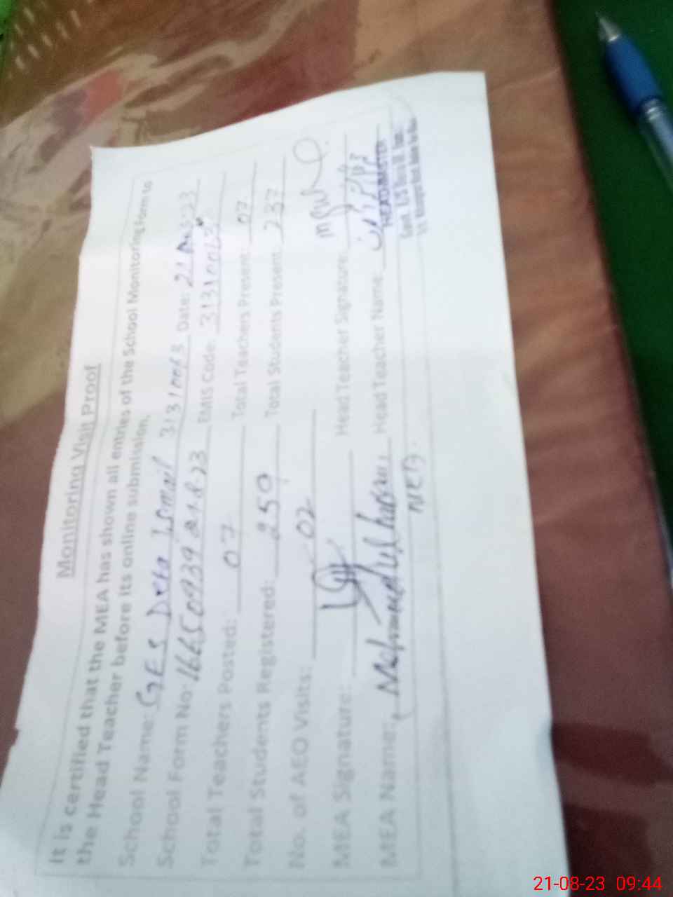 | Attendance Register | Head Teacher | MEA with School | Visit Proof |