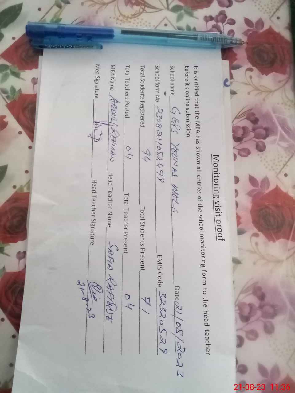 | Attendance Register | Head Teacher | MEA with School | Visit Proof |