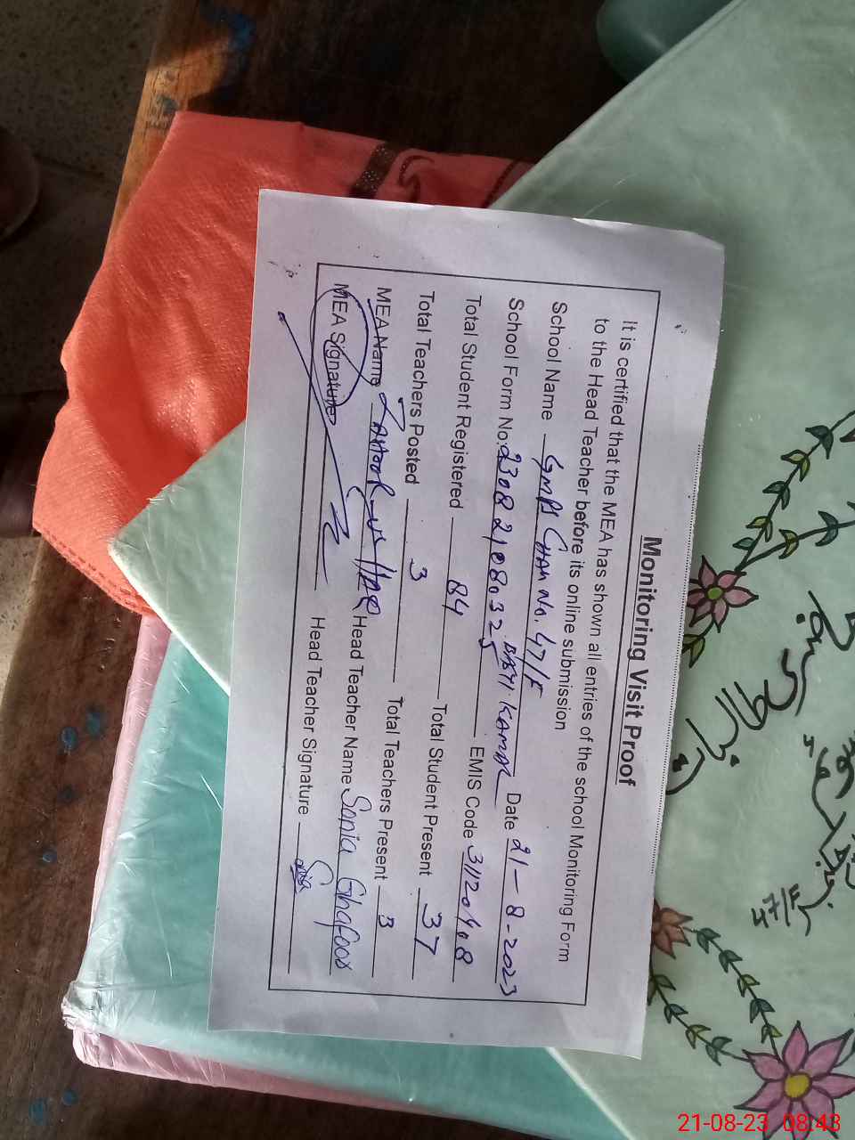 | Attendance Register | Head Teacher | MEA with School | Visit Proof |