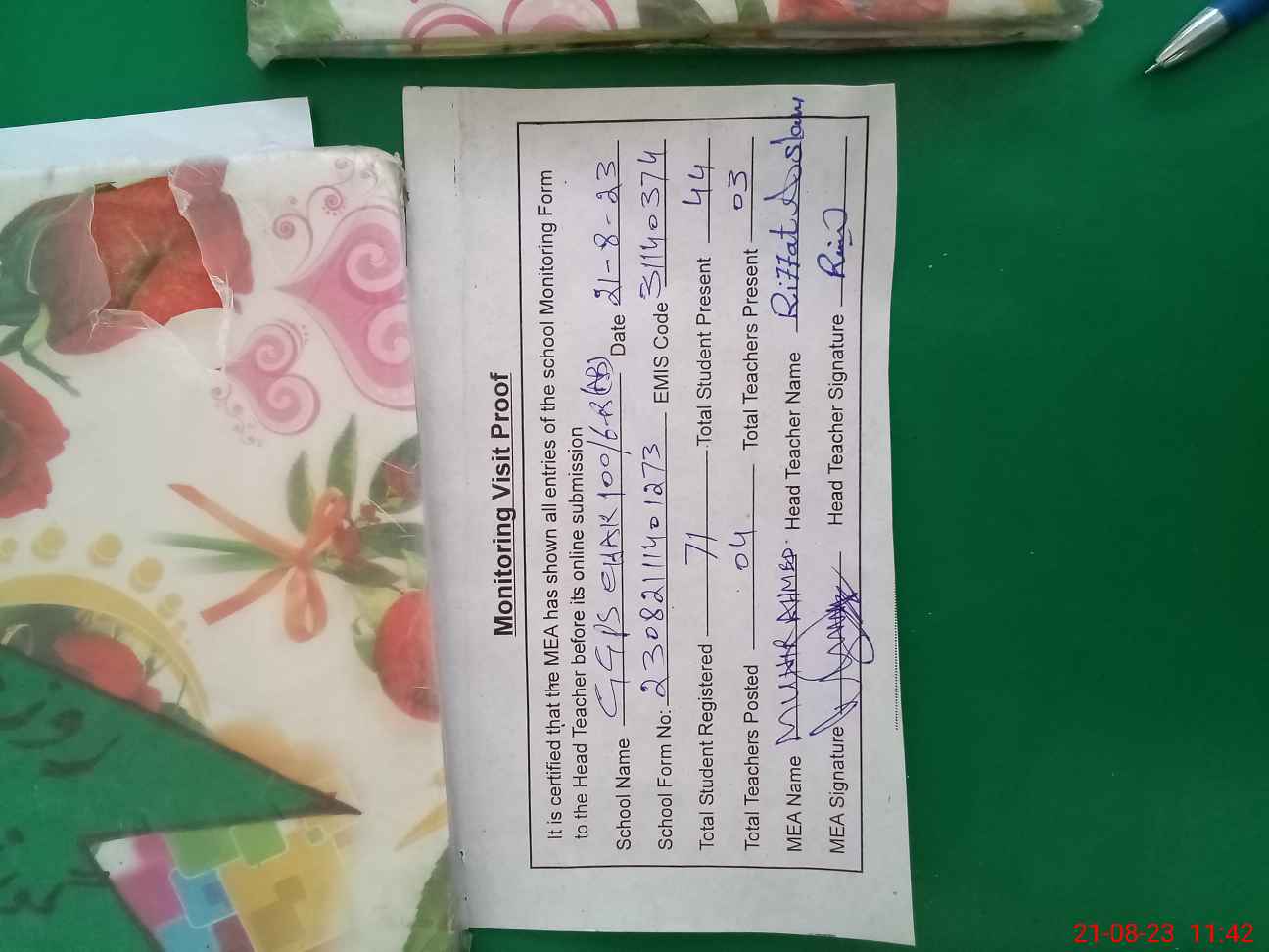 | Attendance Register | Head Teacher | MEA with School | Visit Proof |