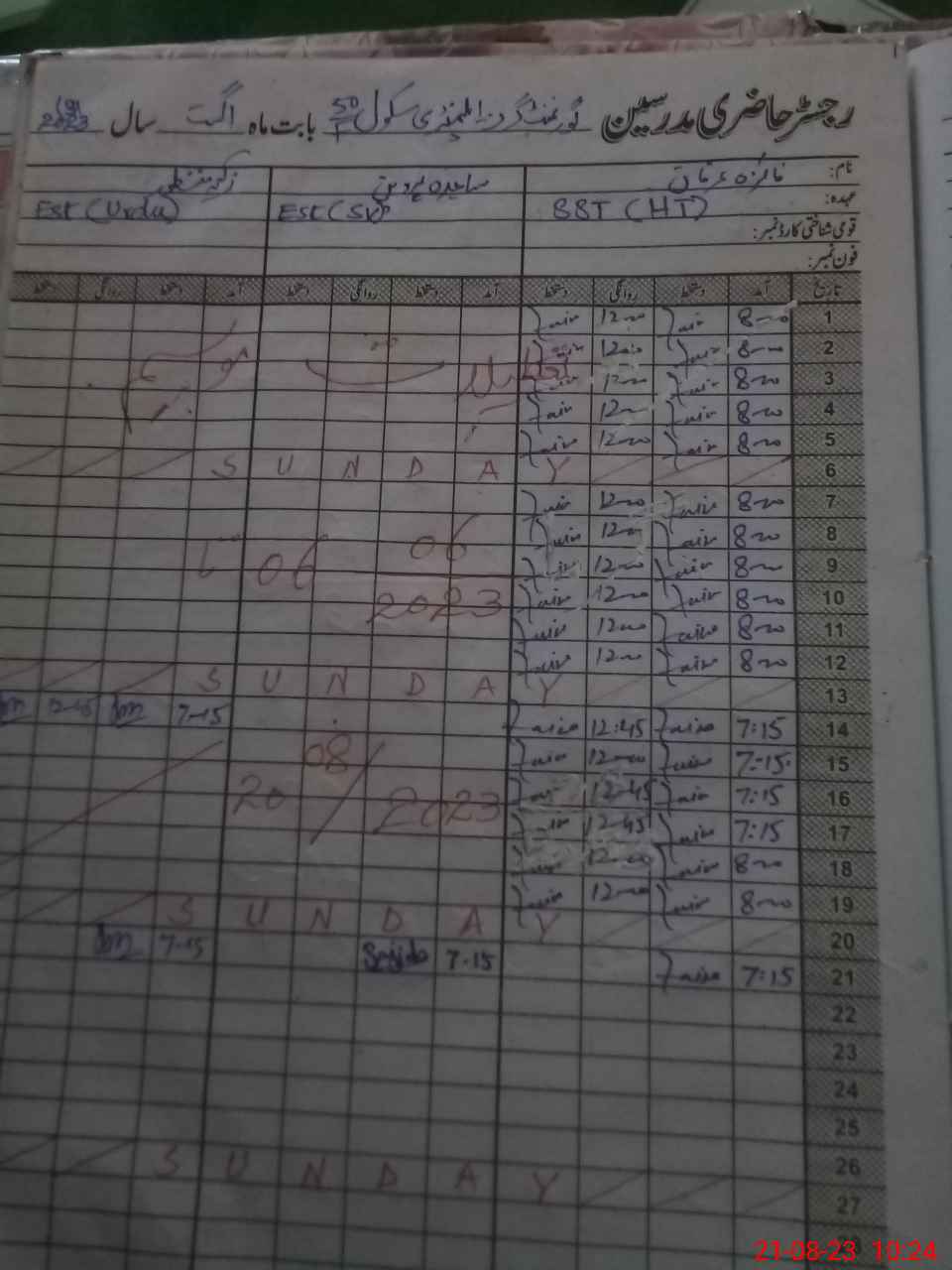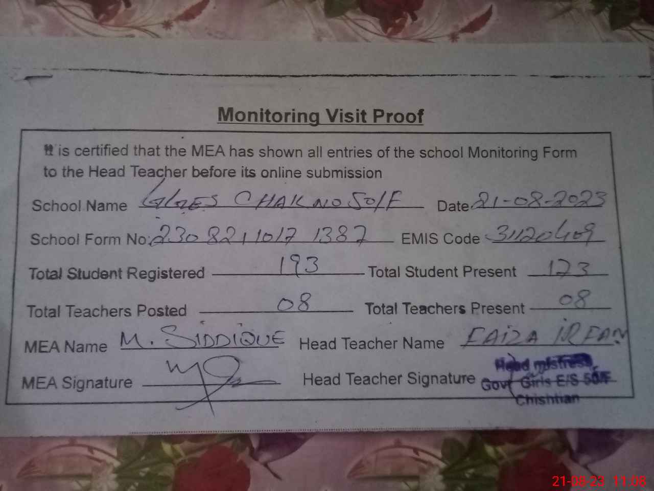 | Name: Fa**** Ir**** Designation: (School Headmaster's/Headmistress's) SST Sc Phone/Cell Number: 03**** |