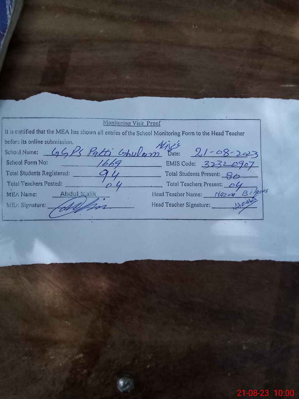 | EMIS Code: 32320907 | Name of School: GGPS PATTI GHULAM ALI GHARBI | |||