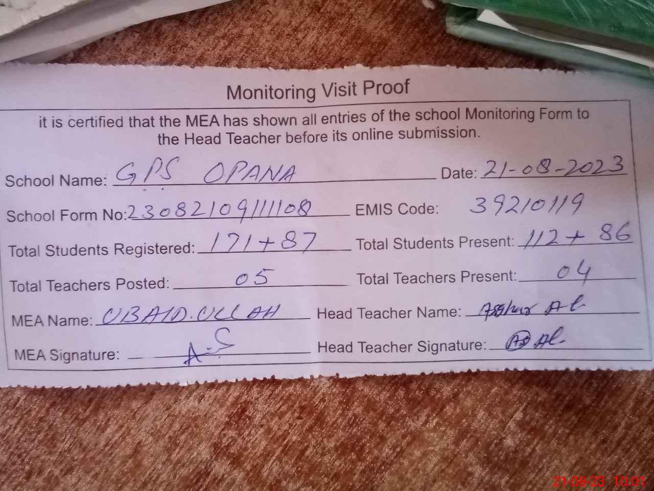 | Attendance Register | Head Teacher | MEA with School | Visit Proof |
