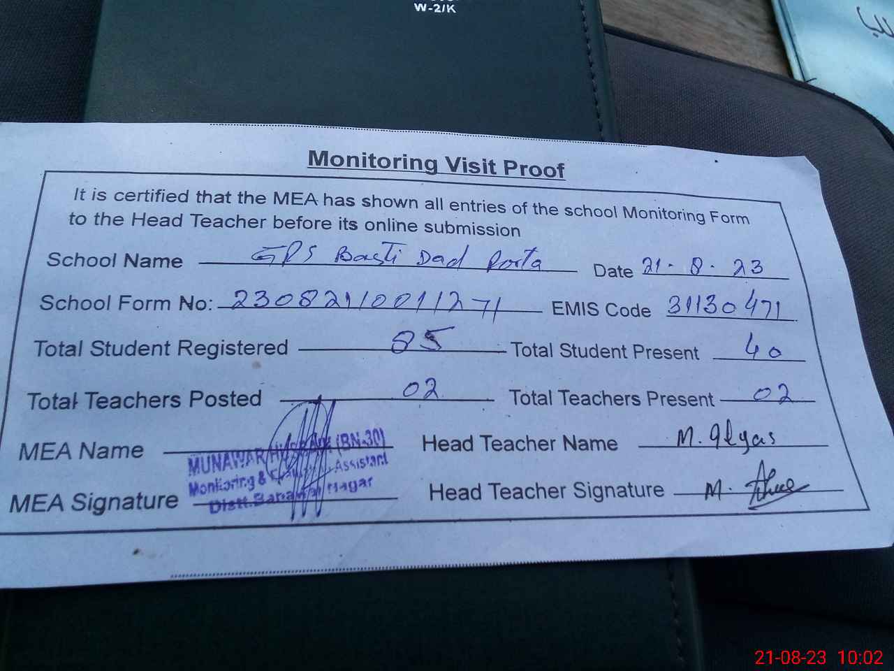 | Attendance Register | Head Teacher | MEA with School | Visit Proof |