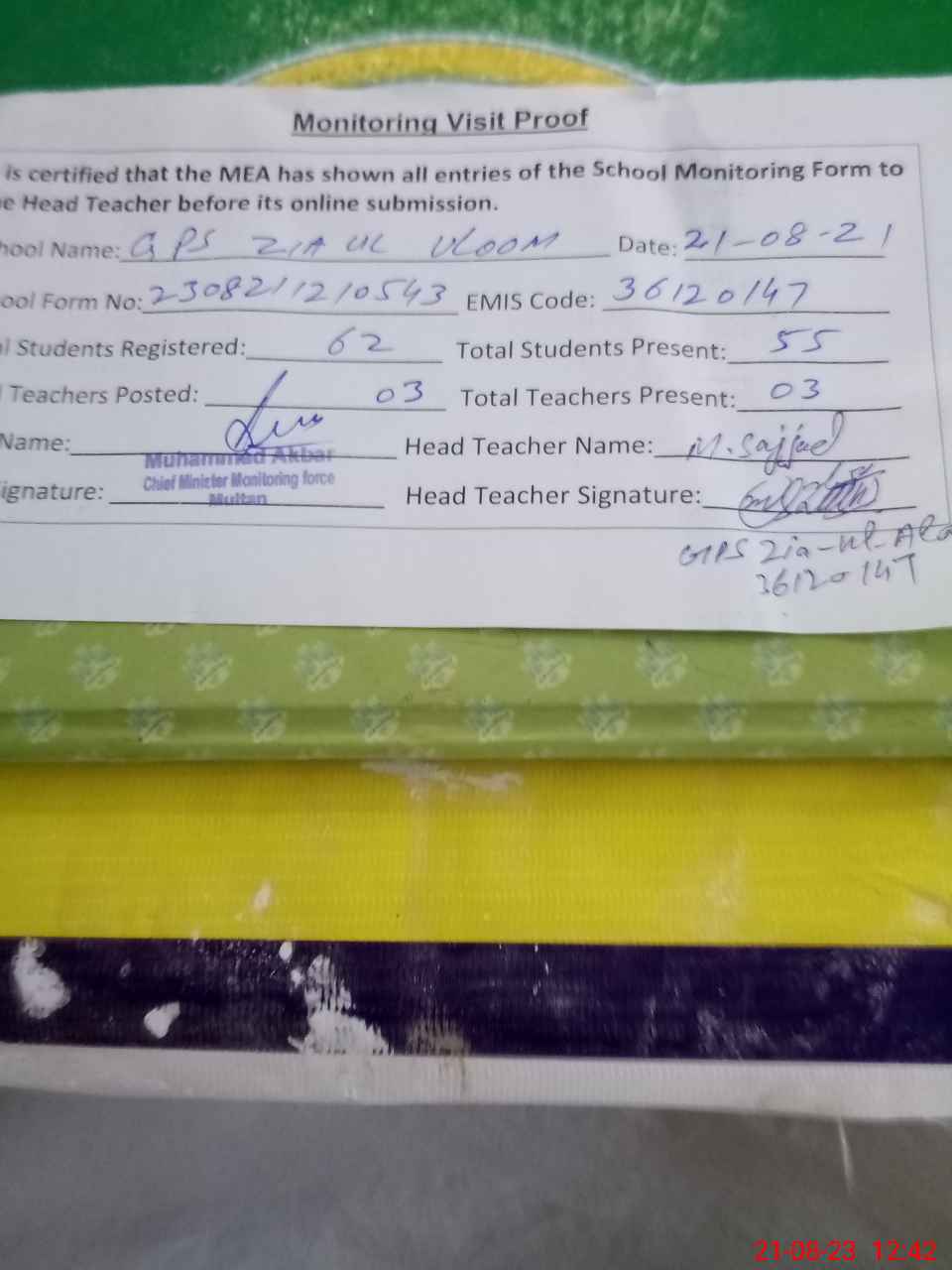 | EMIS Code: 36120147 | Name of School: GPS ZIA-UL-ULOOM MOHALLA HAFIZABAD | |||