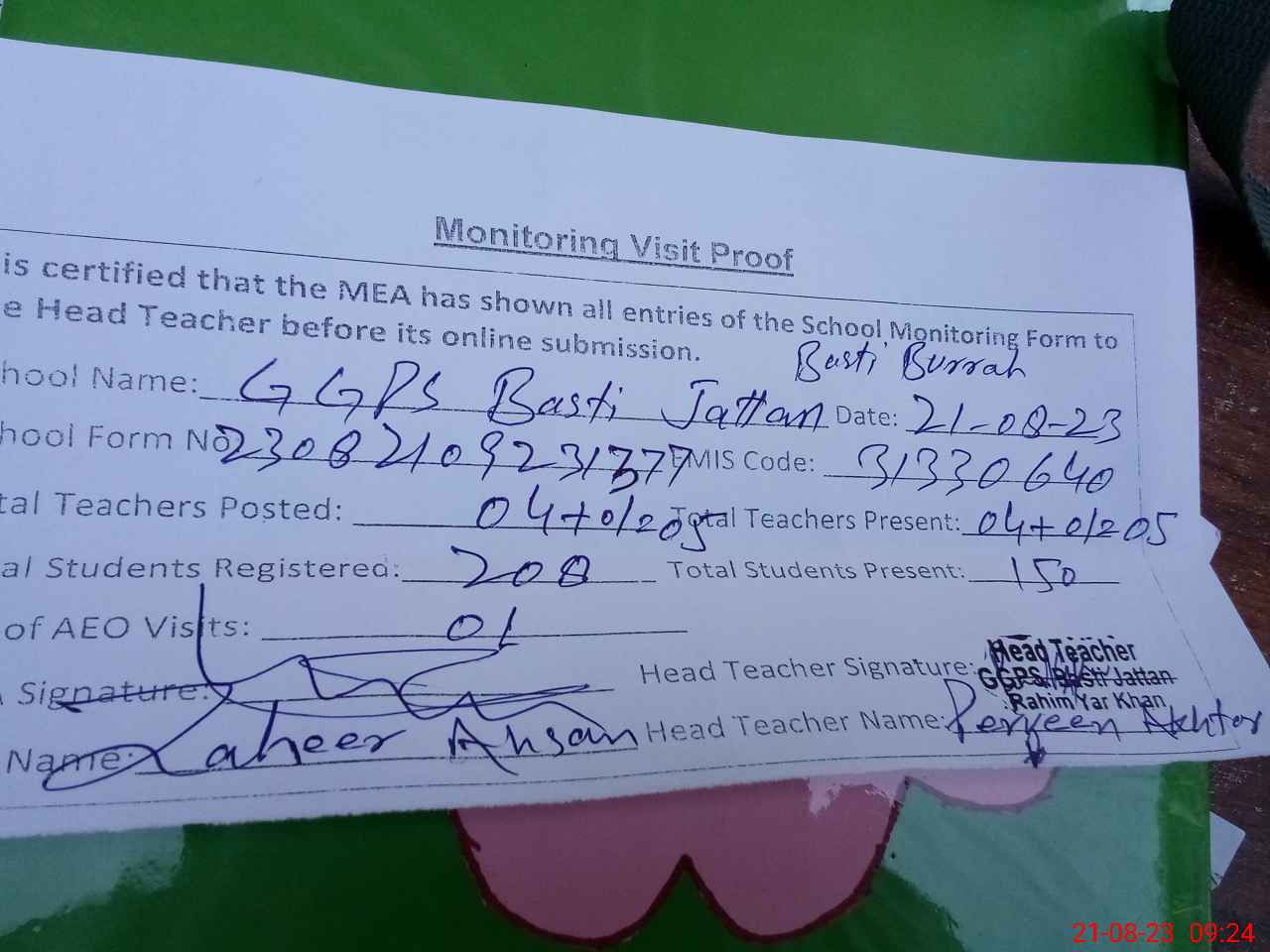 | Attendance Register | Head Teacher | MEA with School | Visit Proof |