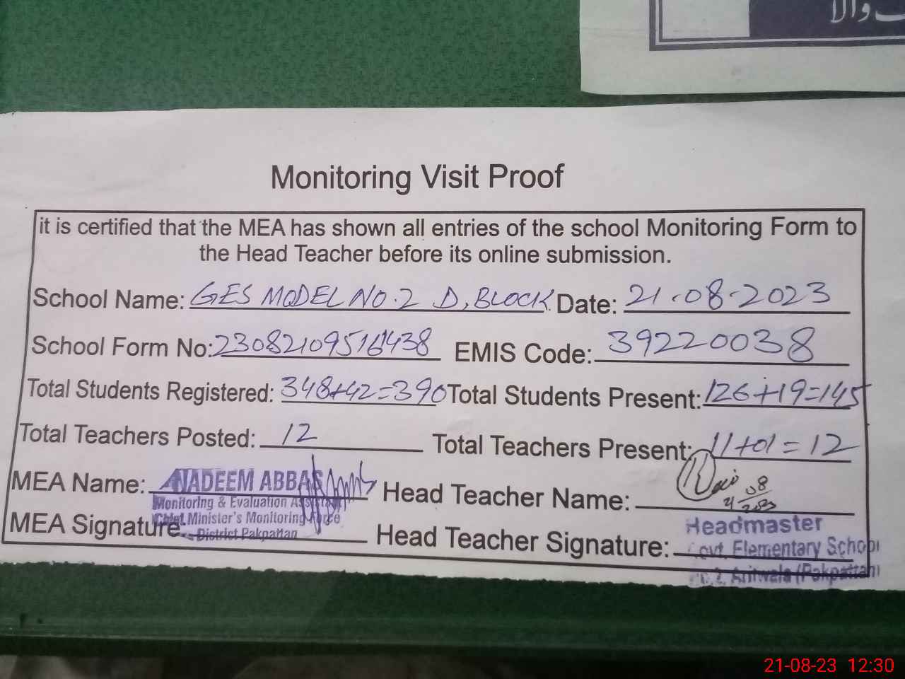 | EMIS Code: 39220038 | Name of School: GES MODEL NO. 2 D BLOCK ARIF WALA | |||