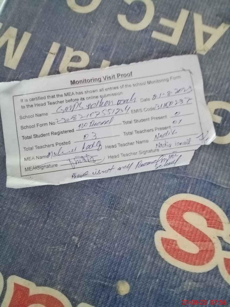| Attendance Register | Head Teacher | MEA with School | Visit Proof |