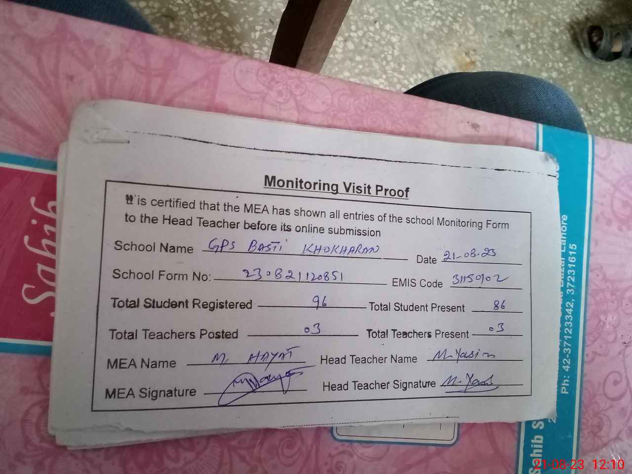 | Attendance Register | Head Teacher | MEA with School | Visit Proof |