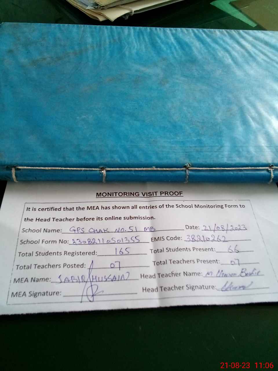 | EMIS Code: 38210262 | Name of School: GPS CHAK NO 51 MB | |||