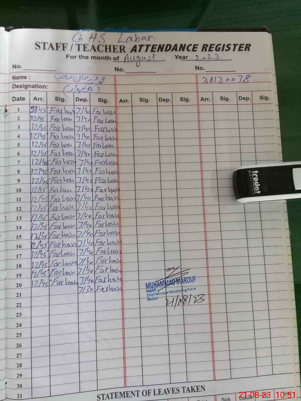 | 36**** | Ja**** Al**** | HEADMASTER | Regular | 0 | 0 | 0 | 0 | 0 | 0 | 0 | 0 | 0 | Exam Duty |