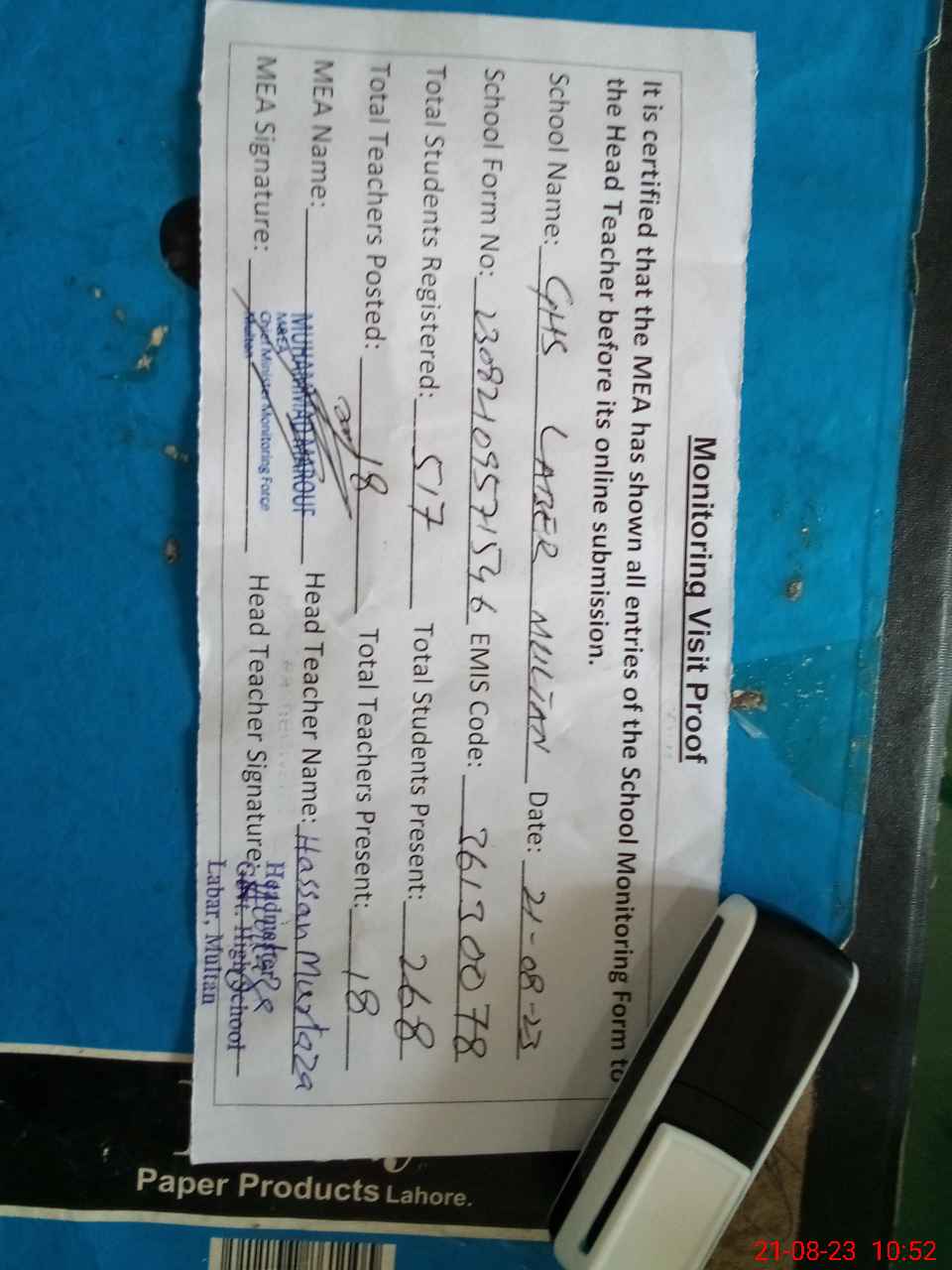 | Name: HA**** MU**** Designation: (School Headmaster's/Headmistress's) Incharge Headmaster SST GEN Phone/Cell Number: 03**** |
