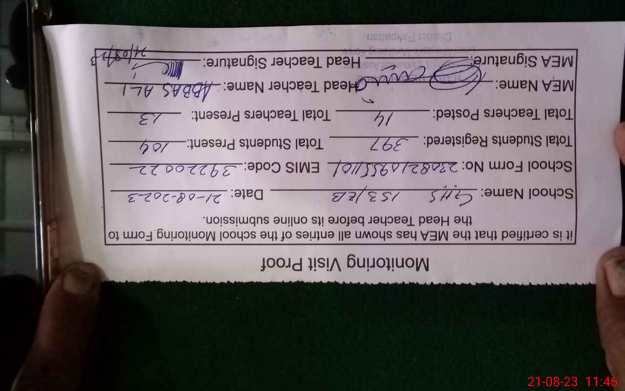 | Certified that this School was Inspected by the Undersigned MEA/DMO Today and the Information Stated Above is as Per Record. | |||||