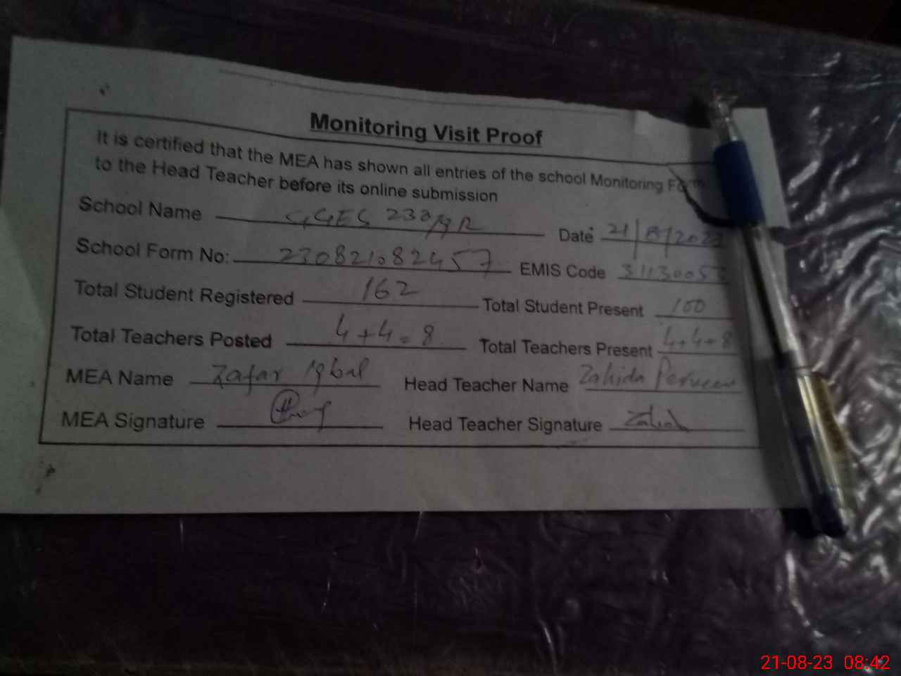 | Attendance Register | Head Teacher | MEA with School | Visit Proof |