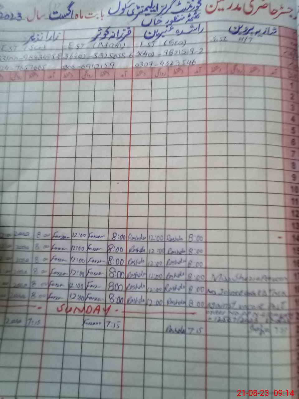 | Name: Sh**** La**** Designation: (School Headmaster's/Headmistress's) EST Phone/Cell Number: 03**** |