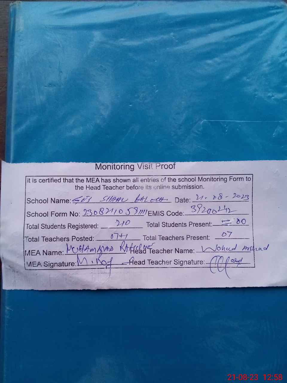 | Attendance Register | Head Teacher | MEA with School | Visit Proof |