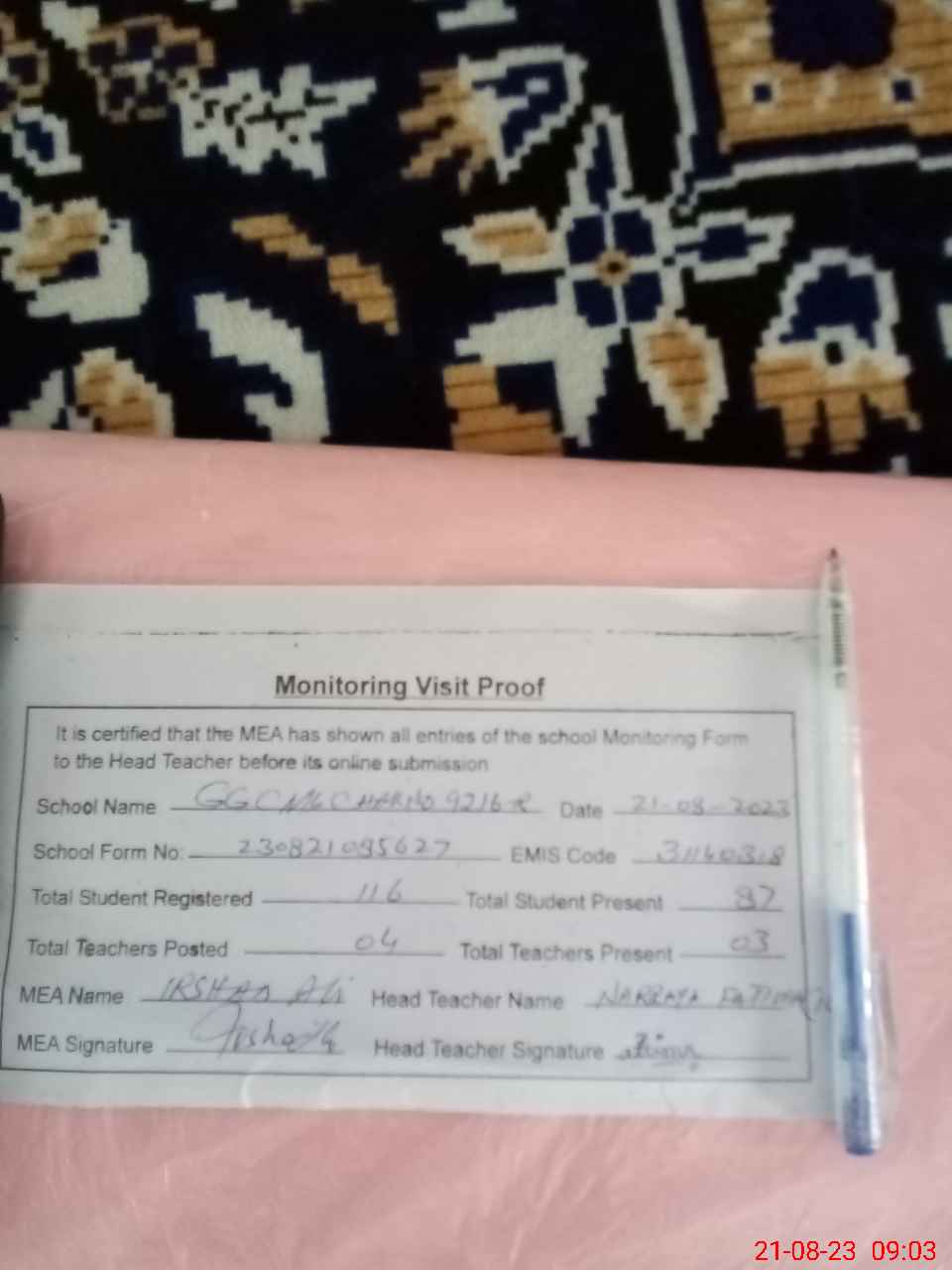| Attendance Register | Head Teacher | MEA with School | Visit Proof |