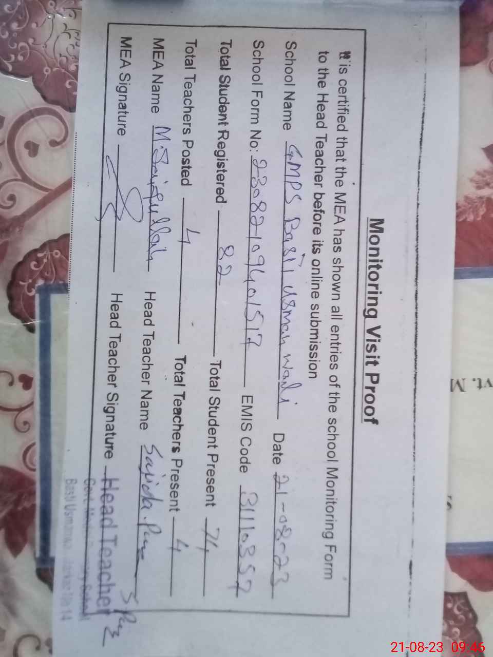 | Certified that this School was Inspected by the Undersigned MEA/DMO Today and the Information Stated Above is as Per Record. | |||||
