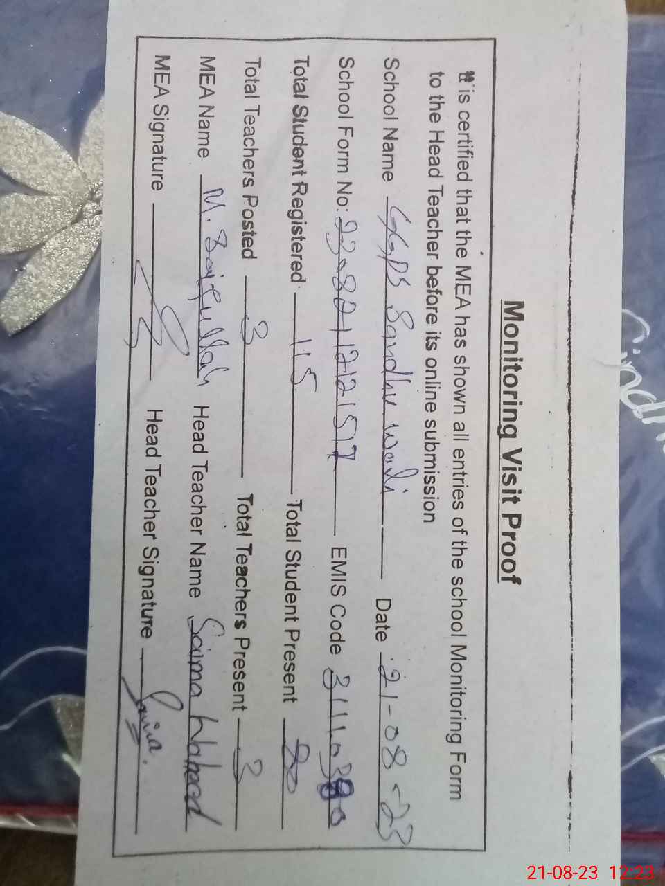| Attendance Register | Head Teacher | MEA with School | Visit Proof |