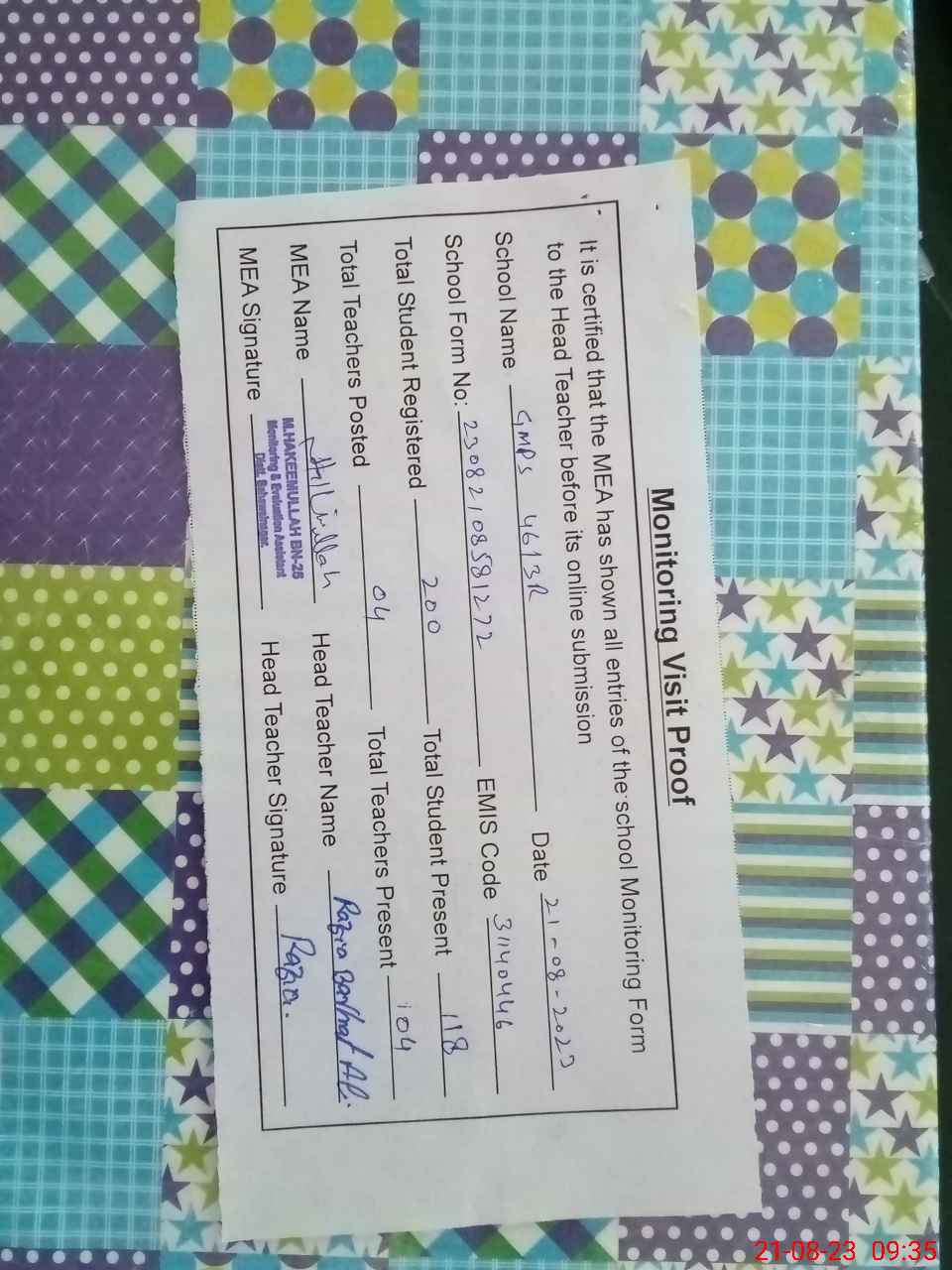 | Certified that this School was Inspected by the Undersigned MEA/DMO Today and the Information Stated Above is as Per Record. | |||||
