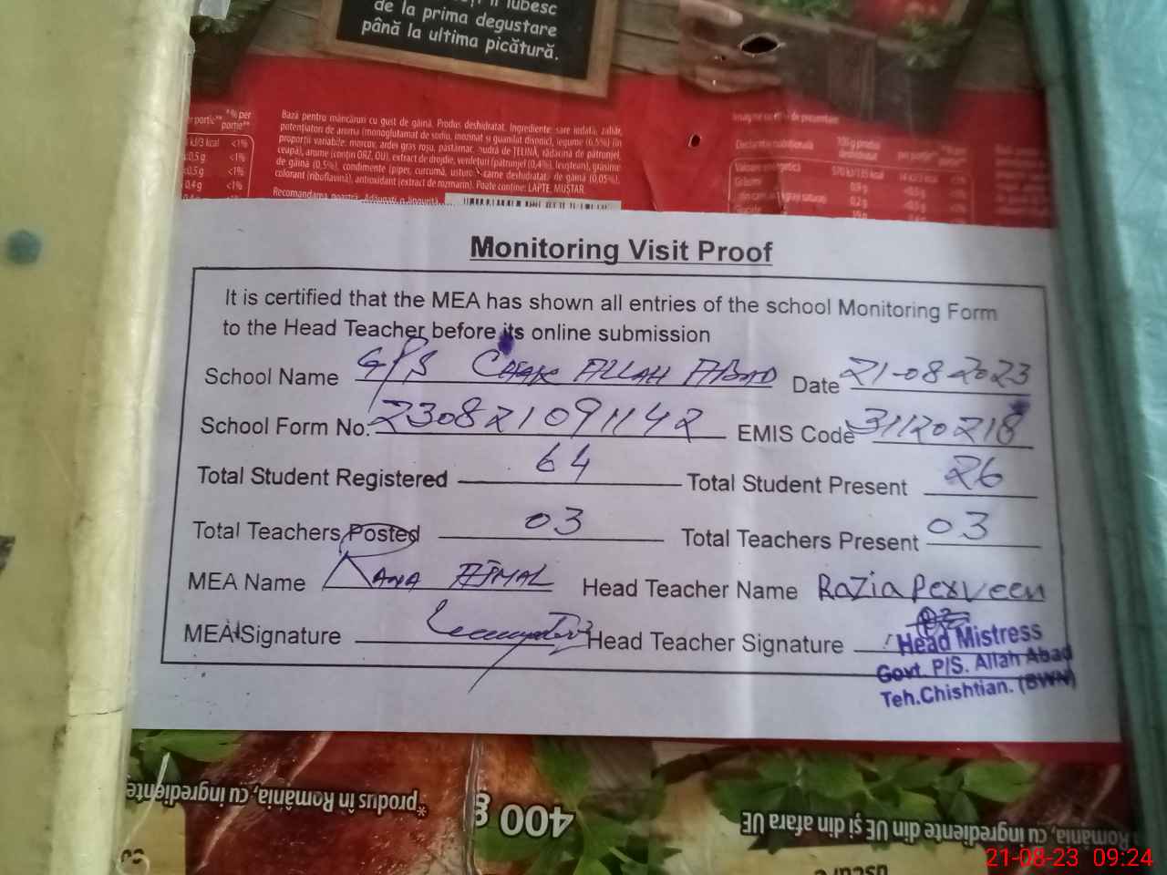 | Attendance Register | Head Teacher | MEA with School | Visit Proof |