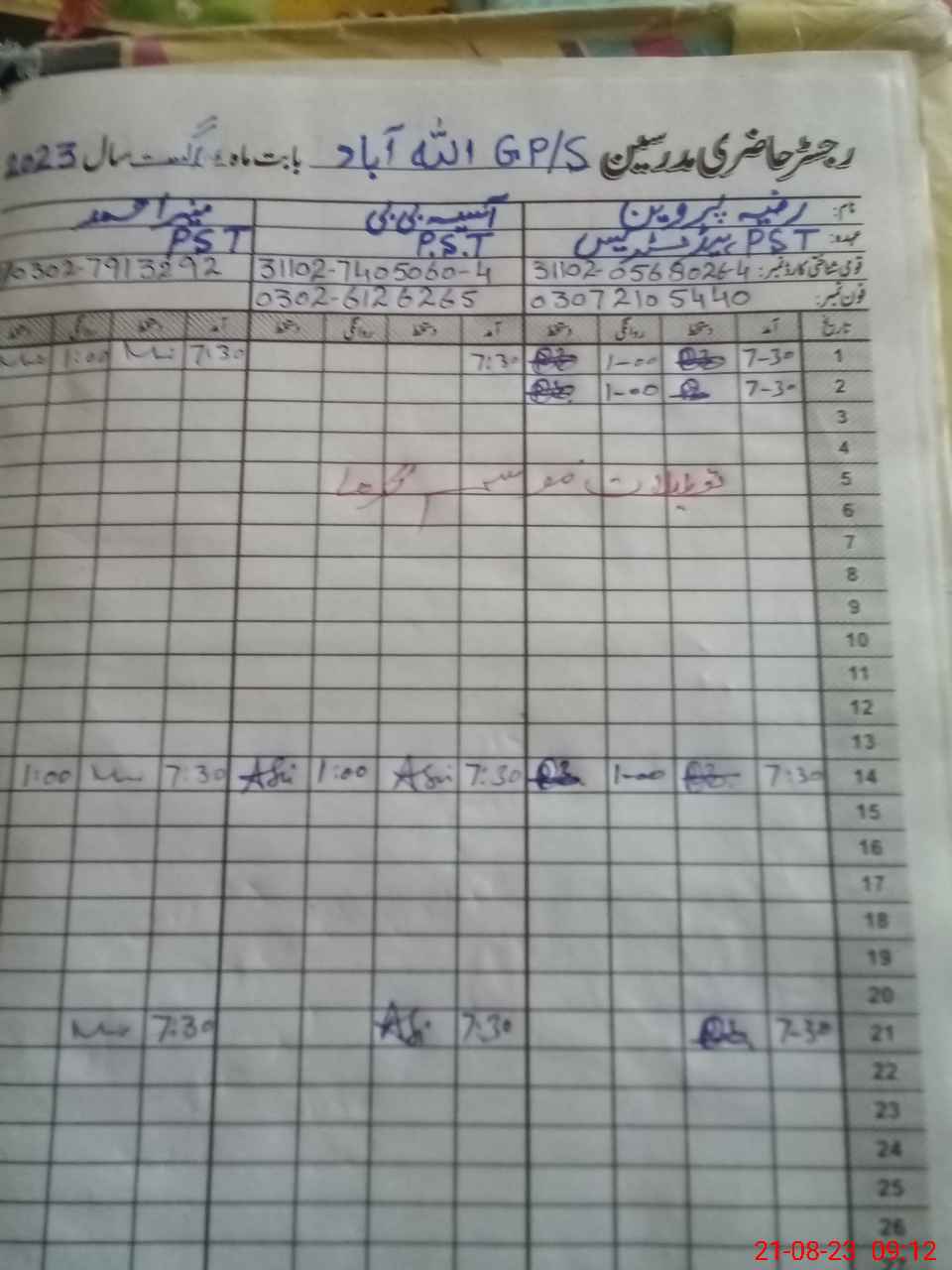 | Name: RA**** PE**** Designation: (School Headmaster's/Headmistress's) P S T Phone/Cell Number: 03**** |
