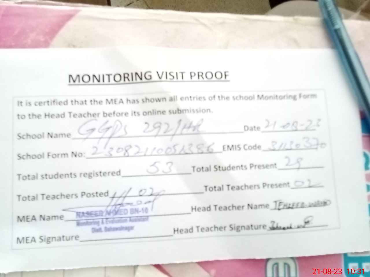 | Attendance Register | Head Teacher | MEA with School | Visit Proof |