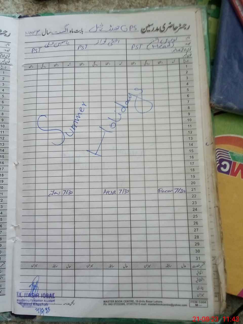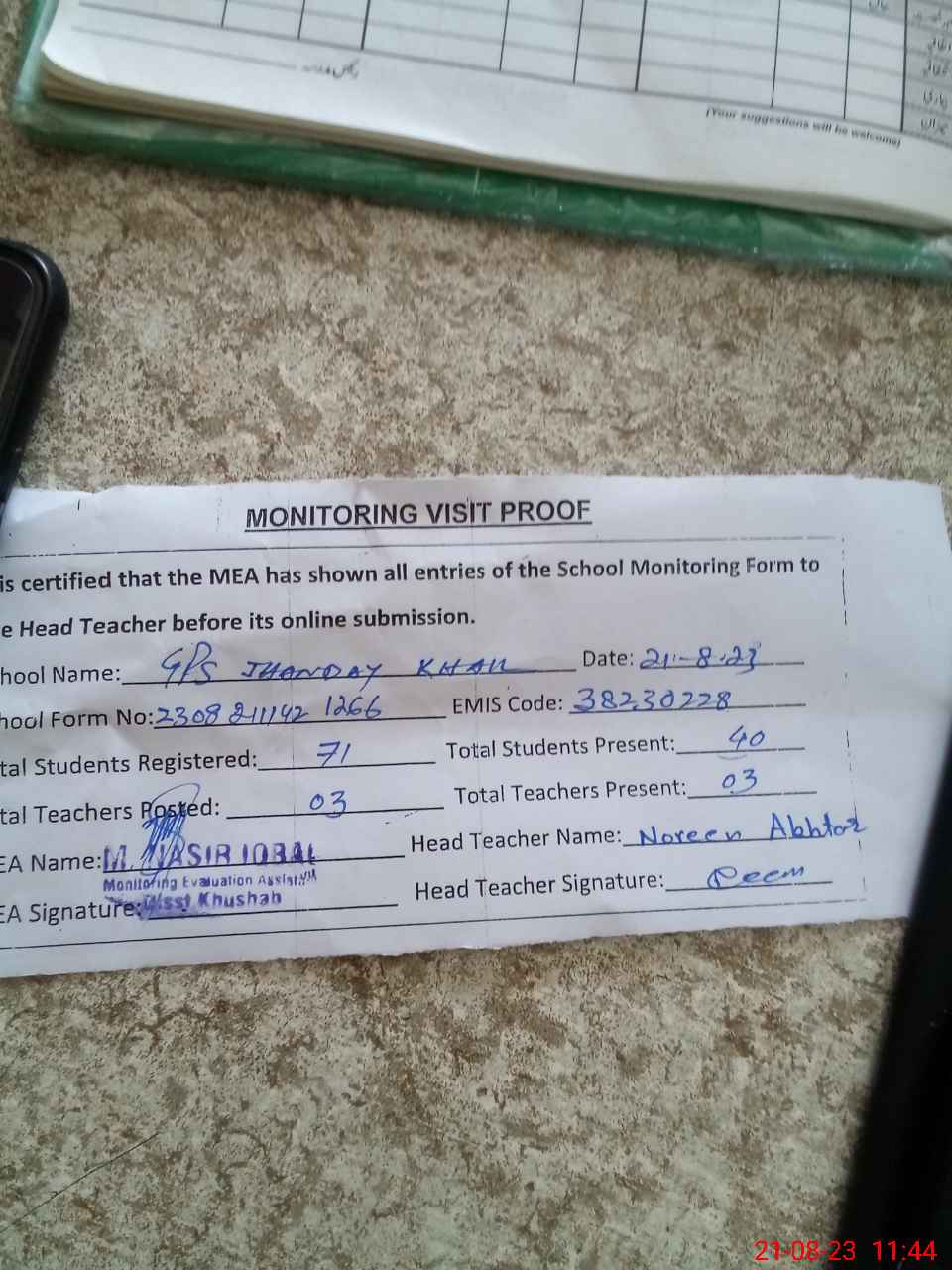 | Attendance Register | Head Teacher | MEA with School | Visit Proof |
