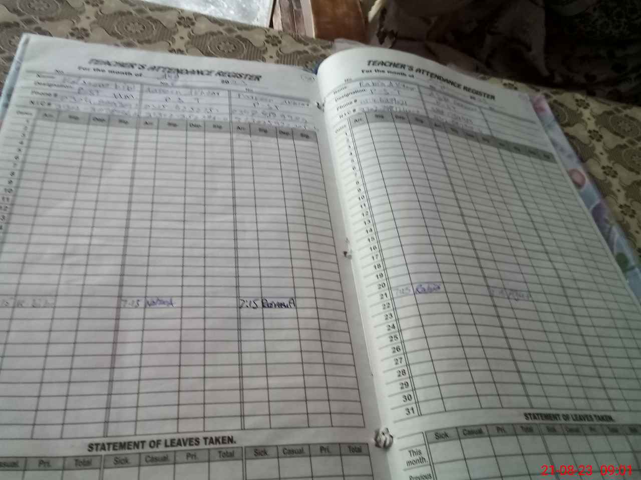 | CNIC | Full Name | Designation | R/C | Absence During Last Calender Month |