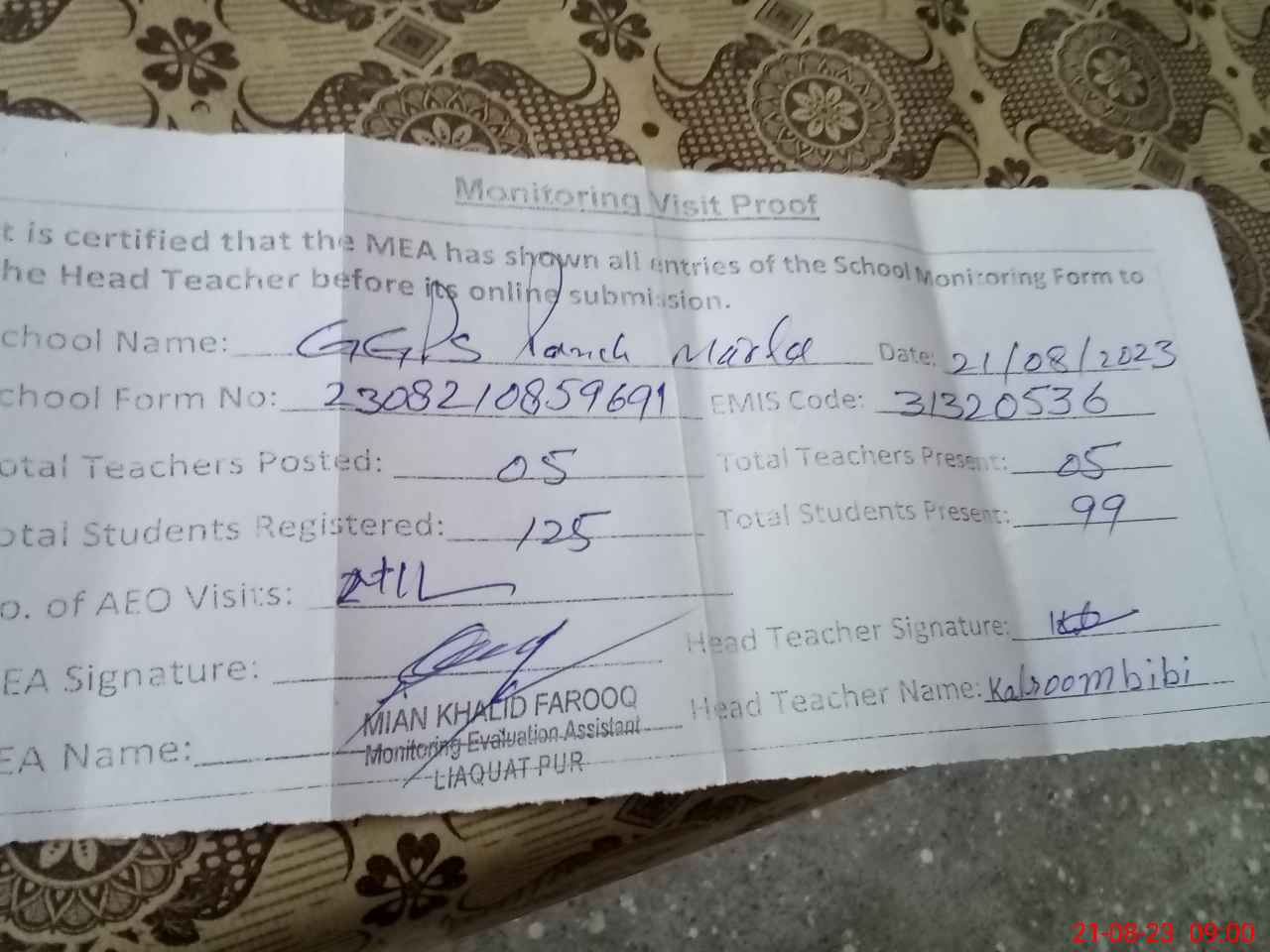 | Attendance Register | Head Teacher | MEA with School | Visit Proof |