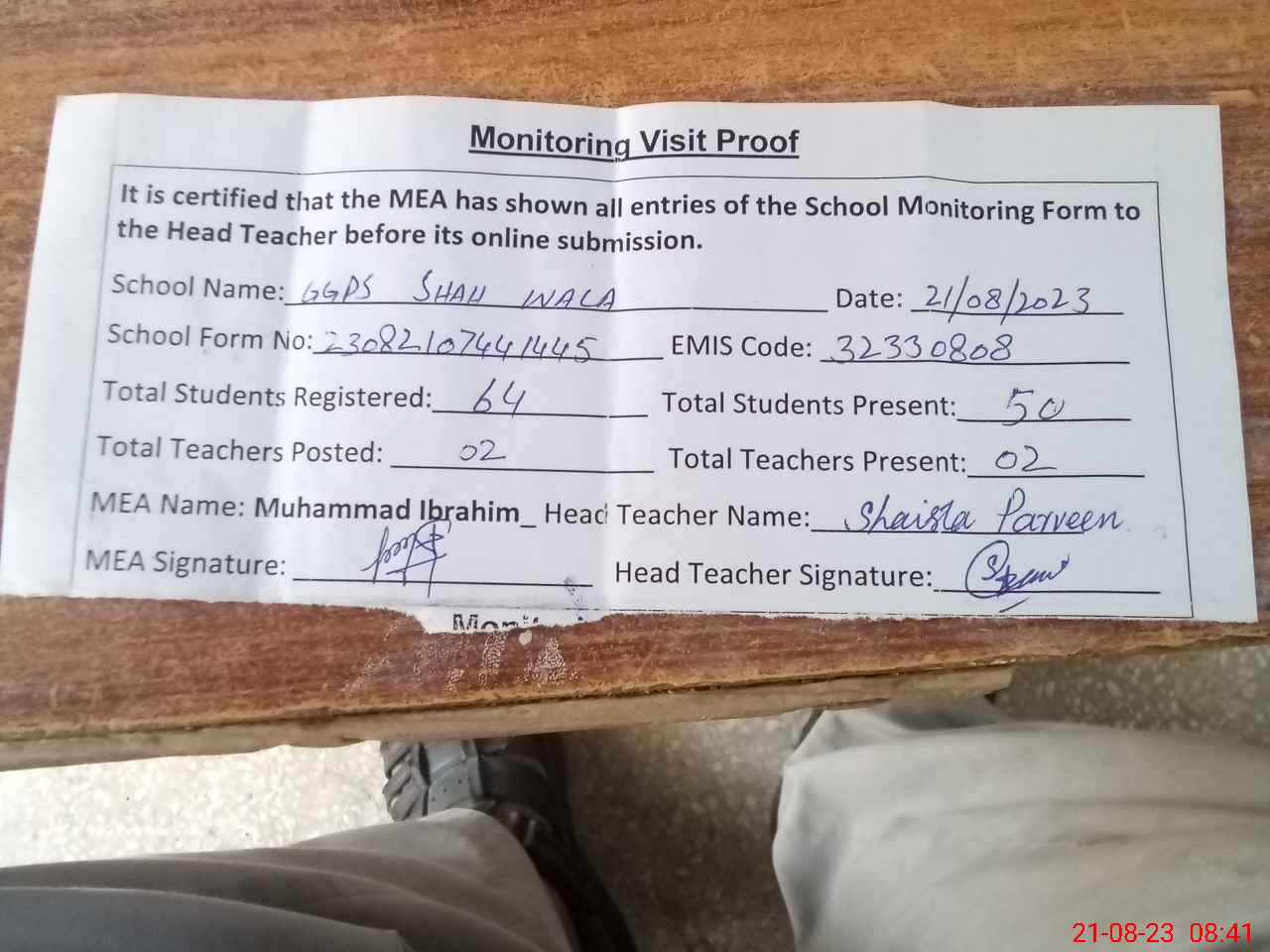 | Attendance Register | Head Teacher | MEA with School | Visit Proof |