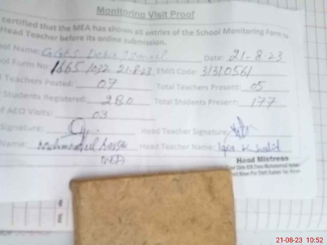 | Attendance Register | Head Teacher | MEA with School | Visit Proof |