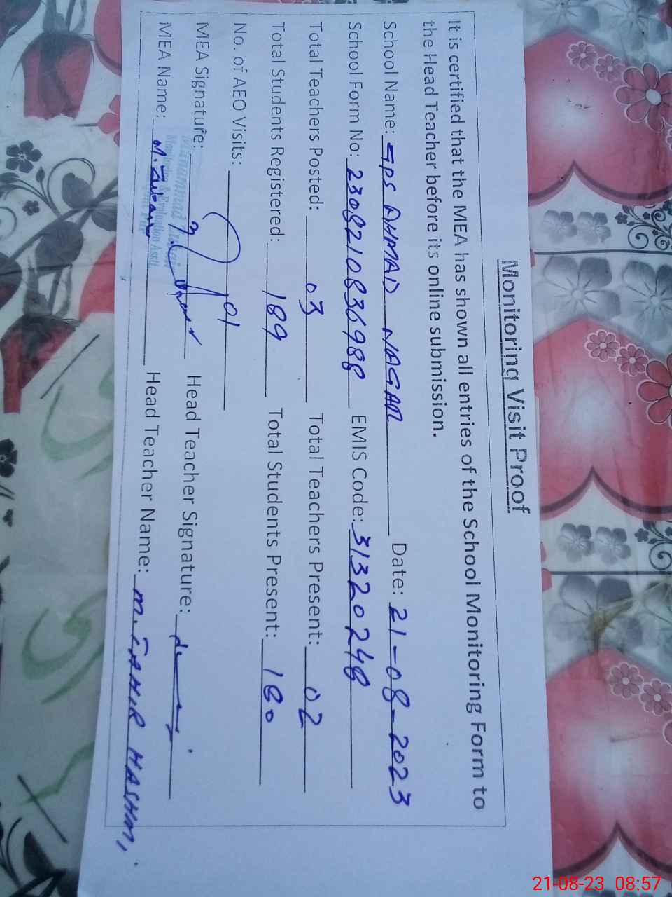 | Certified that this School was Inspected by the Undersigned MEA/DMO Today and the Information Stated Above is as Per Record. | |||||