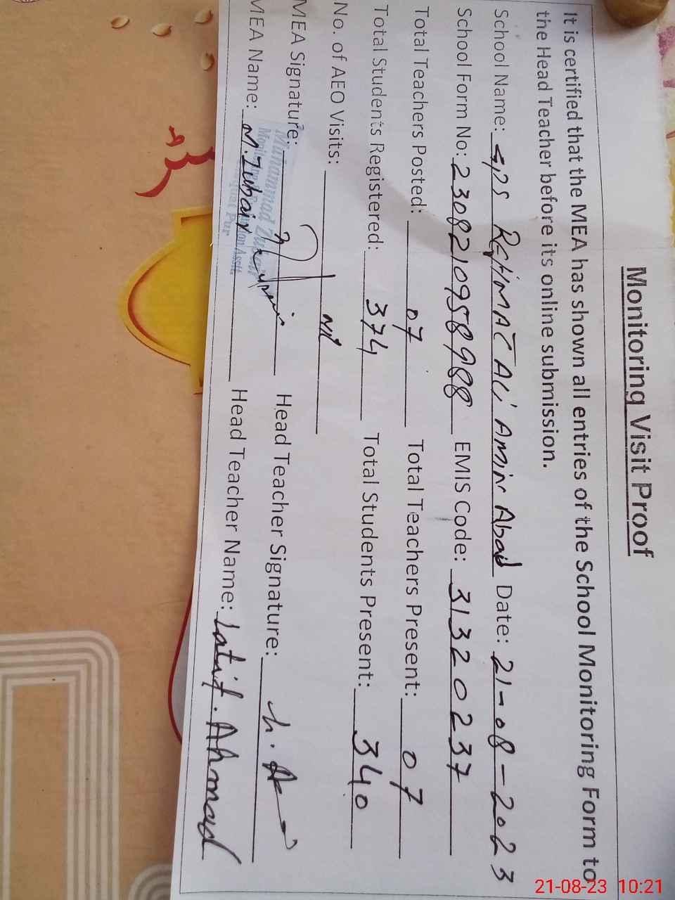 | Attendance Register | Head Teacher | MEA with School | Visit Proof |