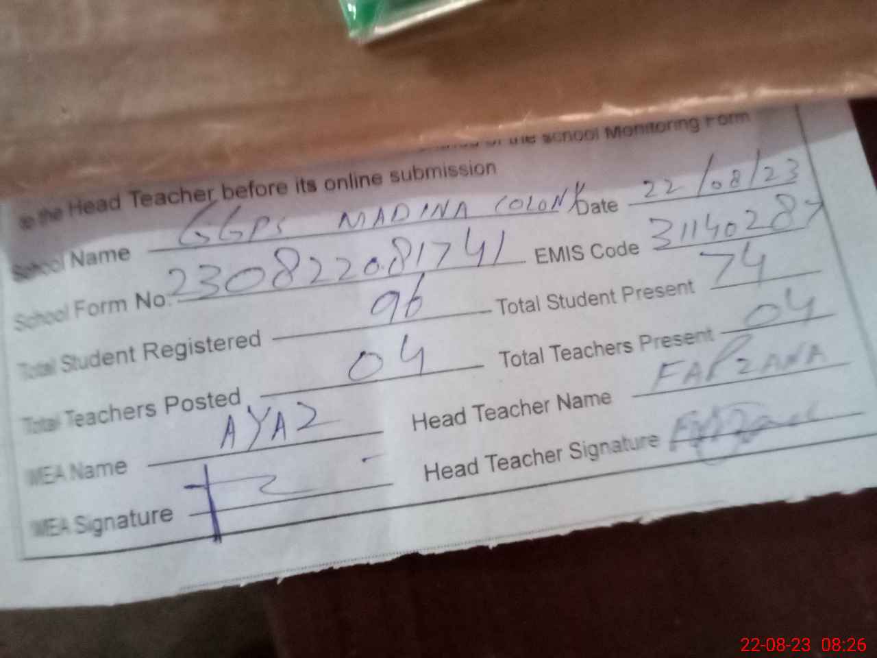 | Attendance Register | Head Teacher | MEA with School | Visit Proof |