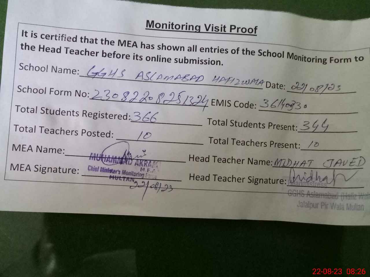 | EMIS Code: 36140330 | Name of School: GGHS ASLAM ABAD (HAFIZ WALA) | |||