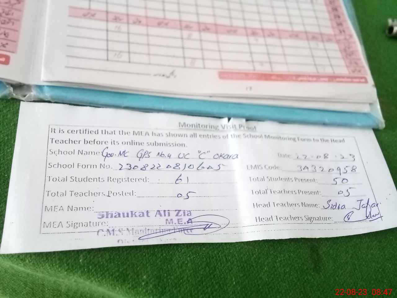 | Attendance Register | Head Teacher | MEA with School | Visit Proof |