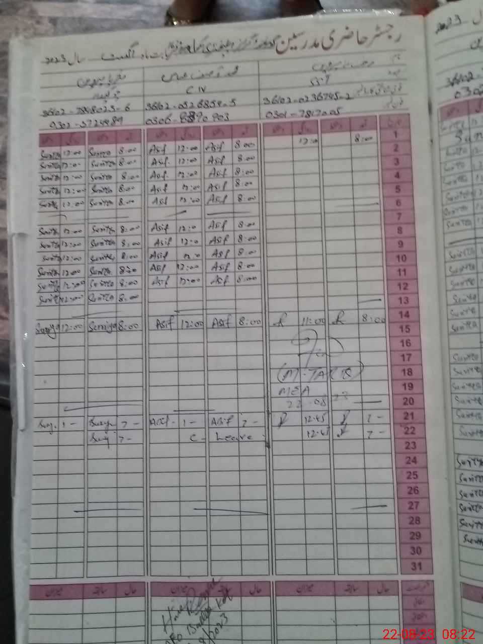 | CNIC | Full Name | Designation | R/C | Absence during last cal. month |
