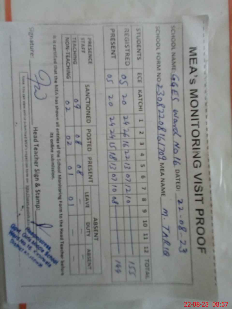| Attendance Register | Head Teacher | MEA with School | Visit Proof |