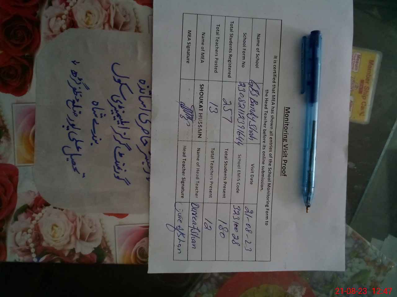 | Attendance Register | Head Teacher | MEA with School | Visit Proof |