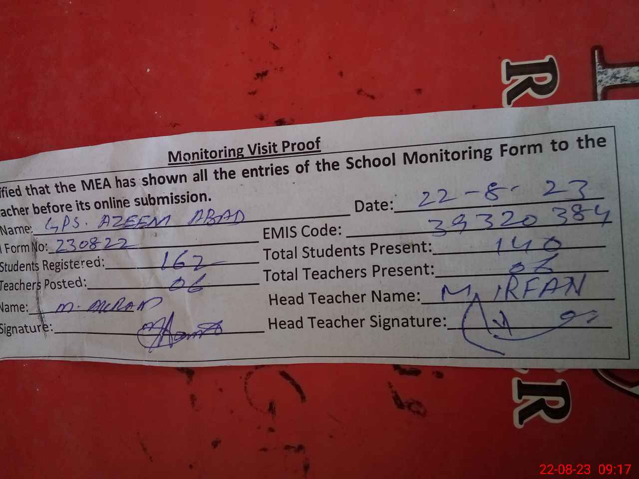 | EMIS Code: 39320384 | Name of School: GPS AZEEM ABAD , OKARA | |||