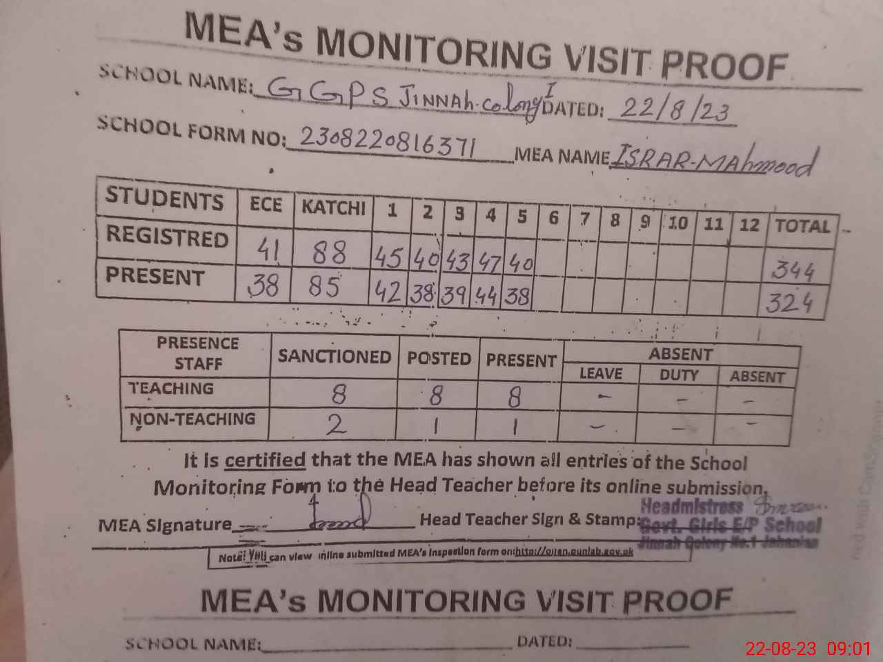 | Attendance Register | Head Teacher | MEA with School | Visit Proof |