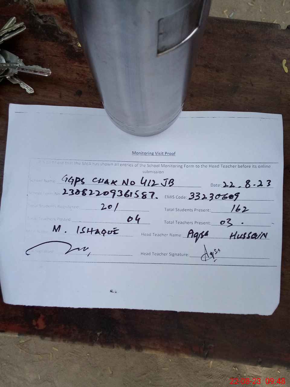 | Attendance Register | Head Teacher | MEA with School | Visit Proof |