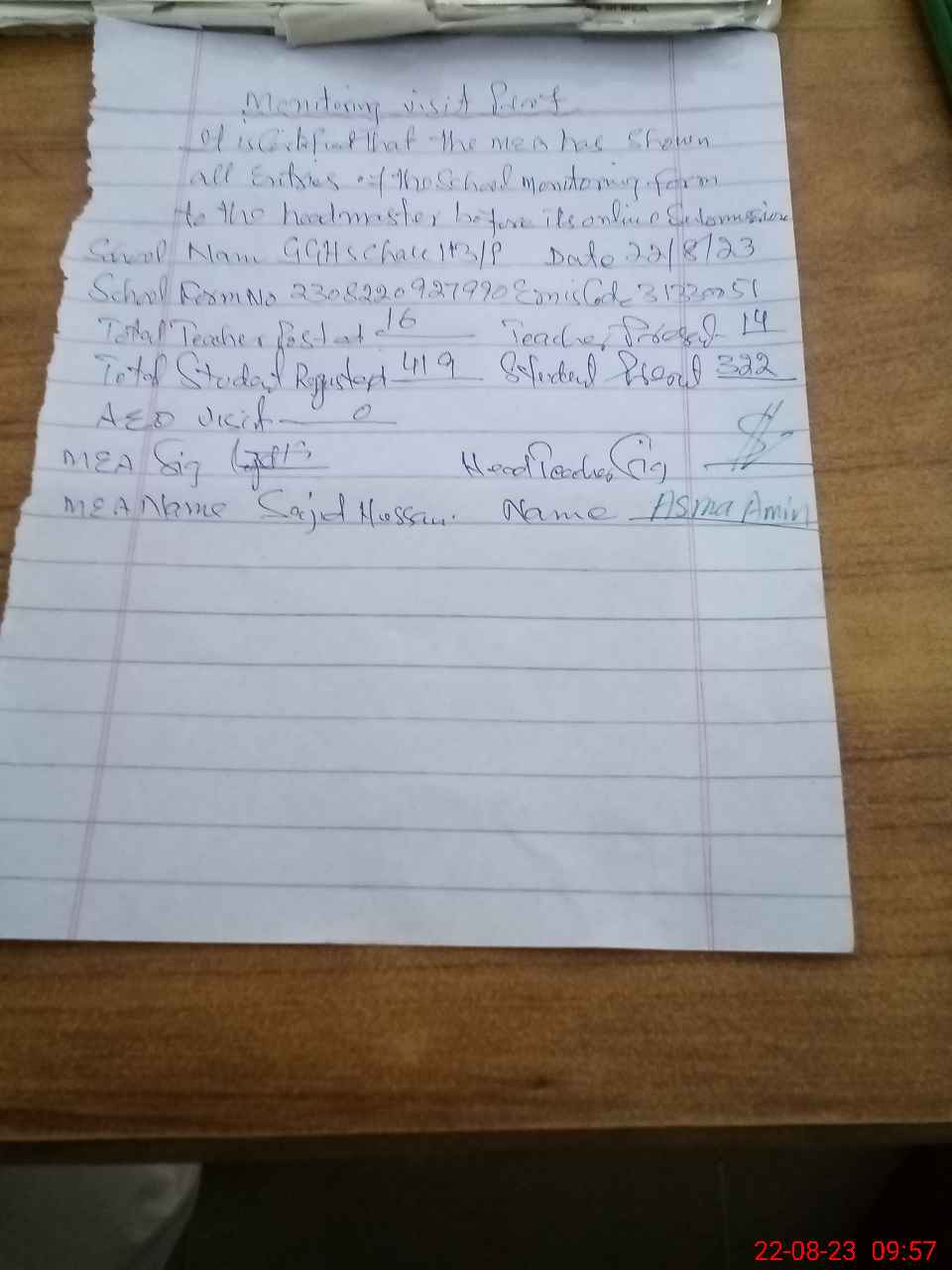 | Attendance Register | Head Teacher | MEA with School | Visit Proof |