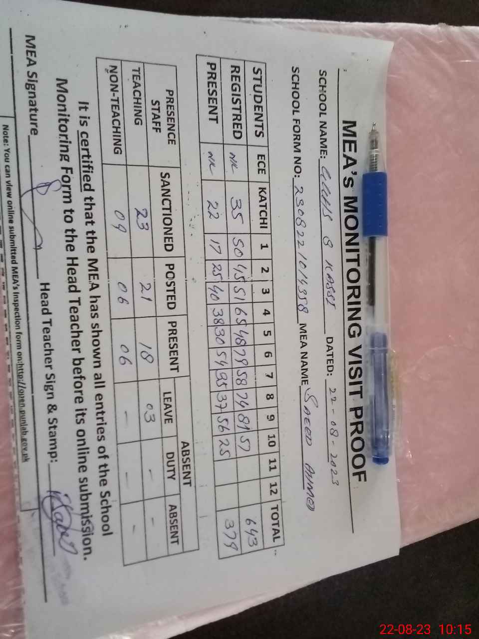 | Attendance Register | Head Teacher | MEA with School | Visit Proof |