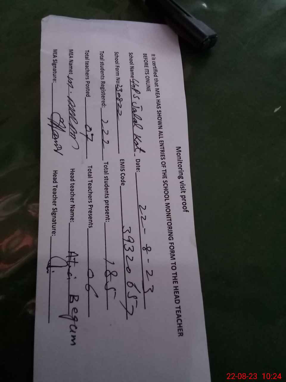 | Name: At**** Be**** Designation: (School Headmaster's/Headmistress's) EST Phone/Cell Number: 03**** |