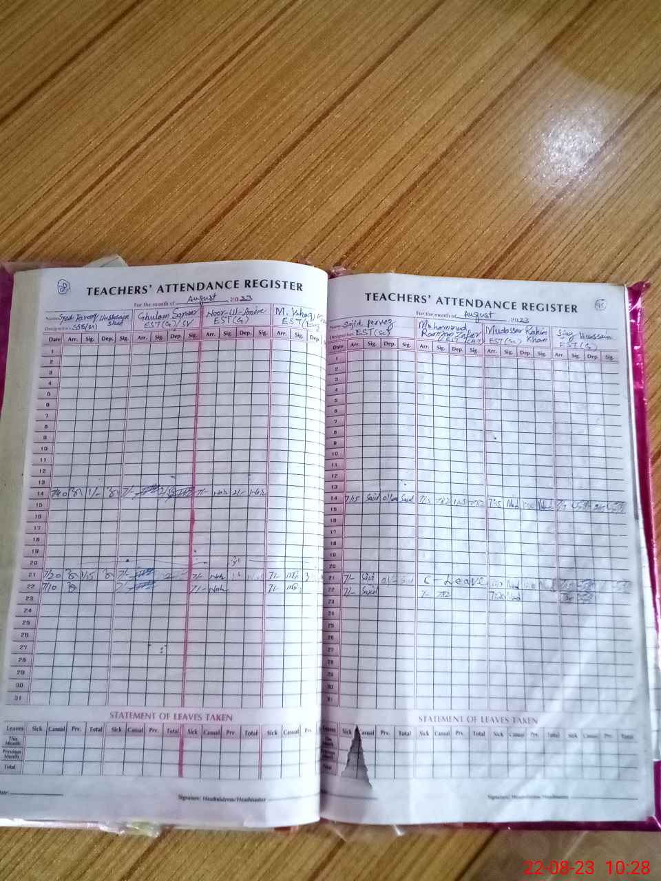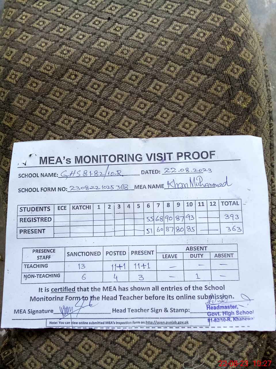| Monitoring Date: 22-08-2023 | Start Time: 22-08-2023 08:15 AM | End Time: 22-08-2023 10:30 AM | Name of MEA: Kh**** Mu**** (S**** 05**** | |