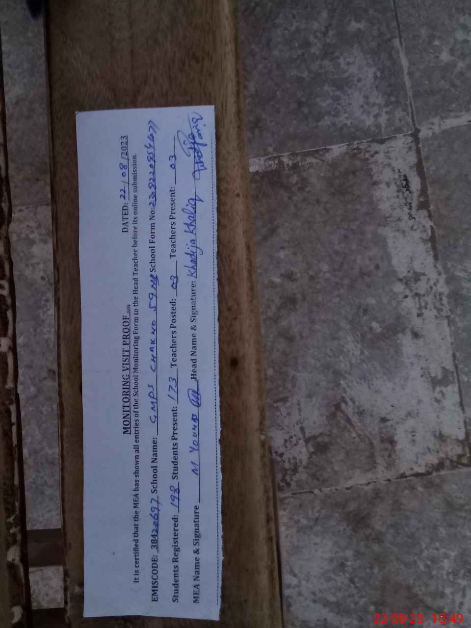 | Attendance Register | Head Teacher | MEA with School | Visit Proof |