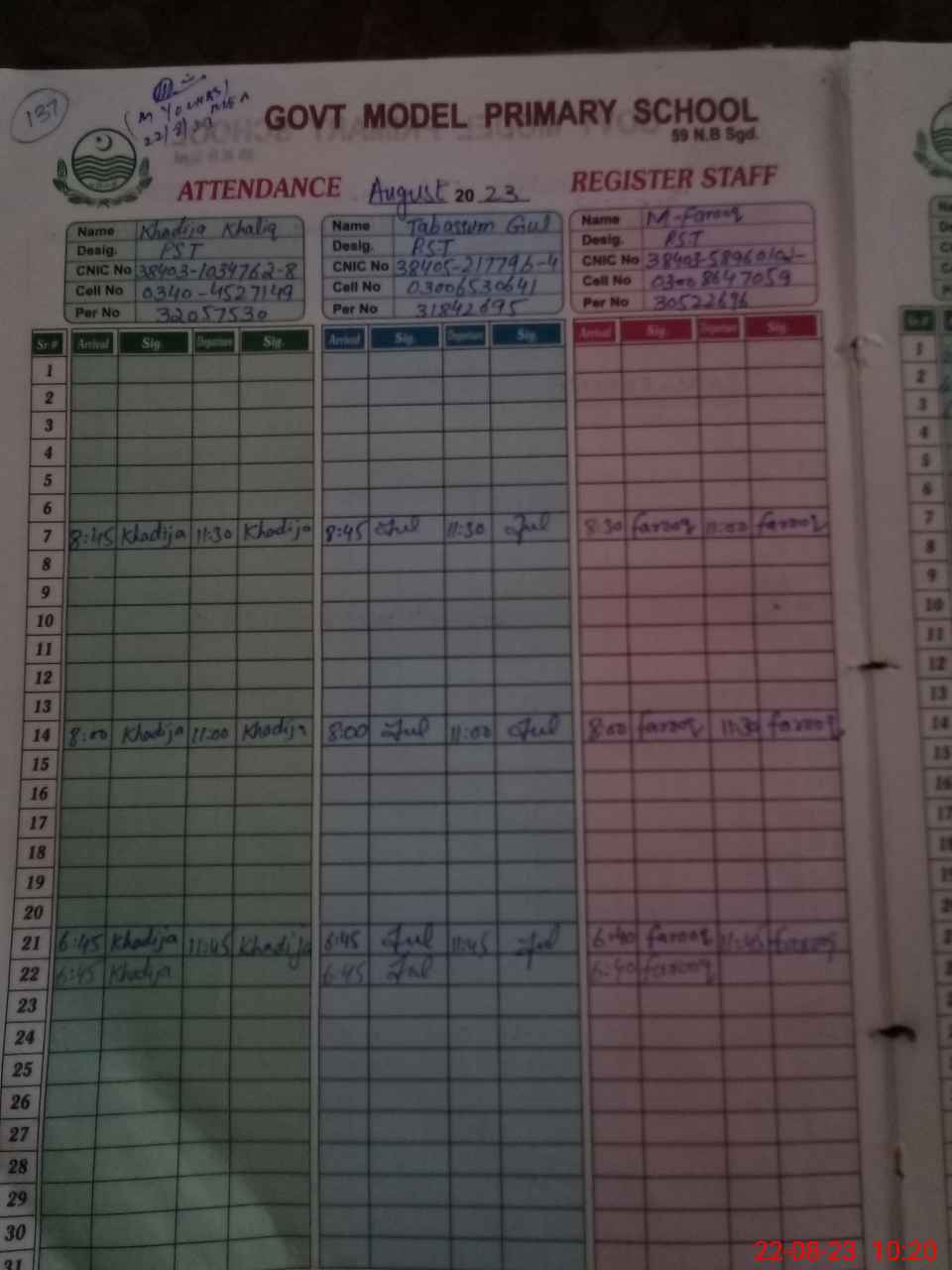 | CNIC | Full Name | Designation | R/C | Absence during last cal. month |